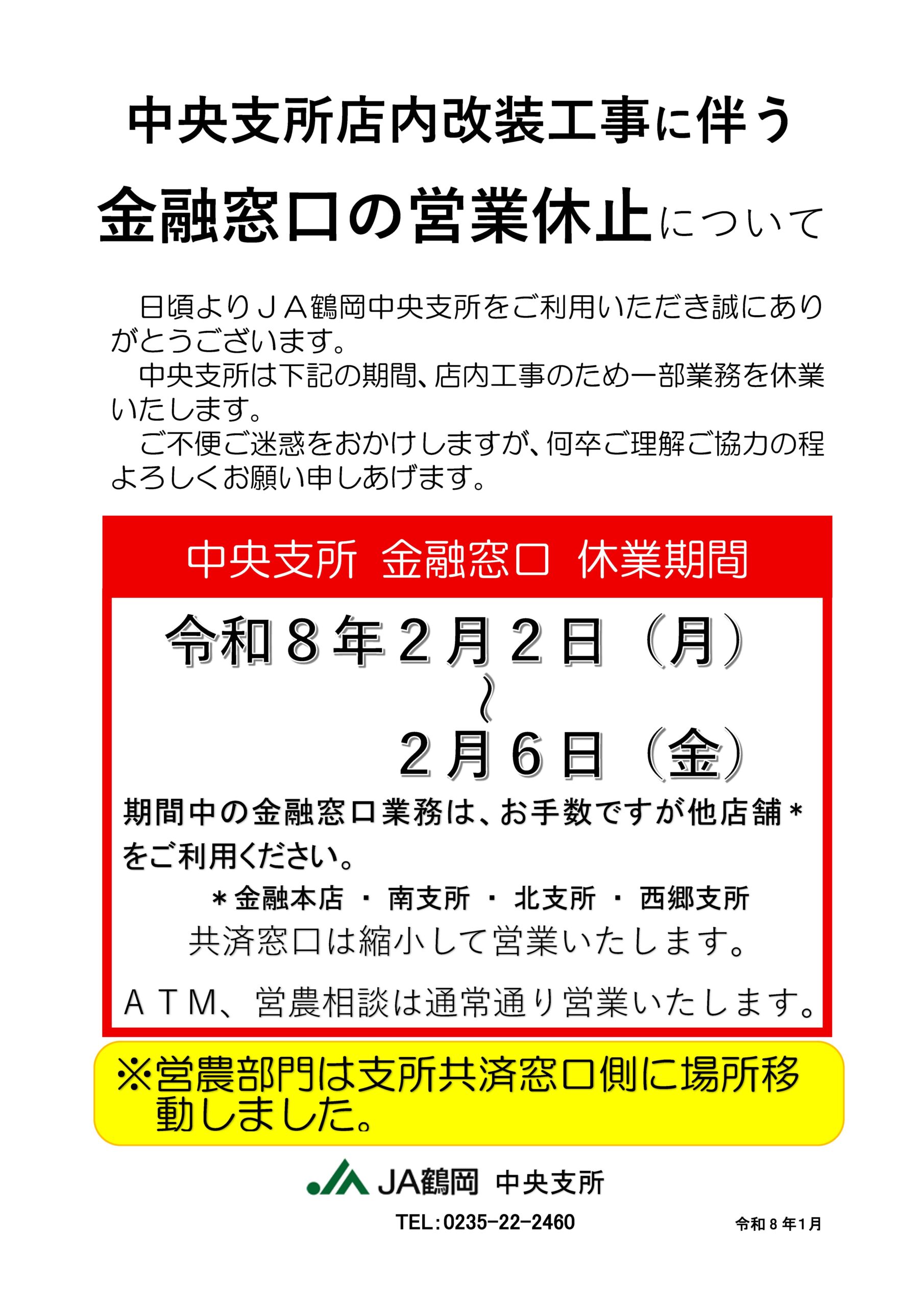 JA鶴岡 [山形県庄内のお米産地] topics 中央支所店内改装工事に伴う金融窓口の営業休止について