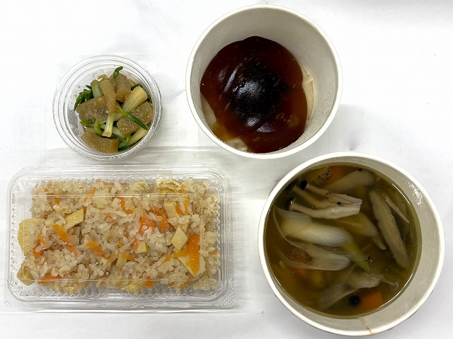 当日は、女性部員16人が講師を務め、同校総合学科家政科学系列食物系2年生28人と一緒に、孟宗(もうそう)ごはん、べろべろ餅のすまし汁、ごま豆腐のあんかけ、あさつきとえごの酢みそあえの4品を調理した。