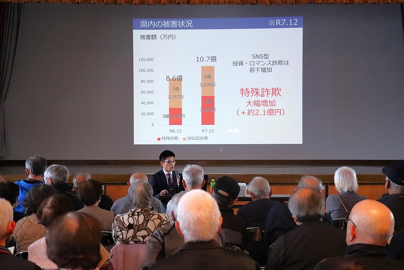 プレー終了後には、鶴岡警察署生活安全課生活安全主任の佐藤侑治さんを講師に迎え、「特殊詐欺の被害状況と対策」をテーマに講演いただいた。