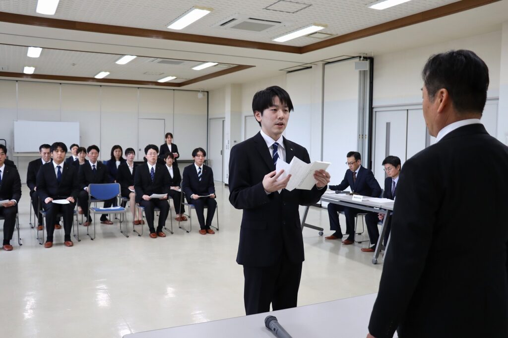 新規採用職員を代表して、酒井大樹さんが「鶴岡の豊かな自然と文化を大事にしながら、組合員の皆様に信頼される職員になれるよう努力していきたい」と決意を述べた。