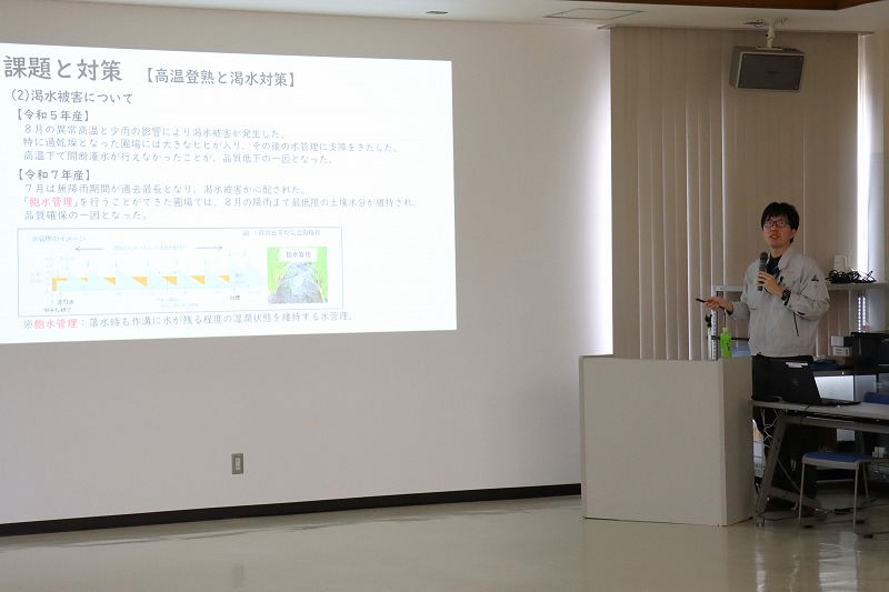 検討会では耕種指導係が令和7年産の作柄概況を説明した。7月は高温少雨により収量・品質面で心配されたため高温対策として水管理を徹底した。また登熟期間中は日照が多く登熟が進み、高単収・高品質につながった。平均単収は602㌔/10㌃(前年+48㌔)、一等米比率97.9%、タンパク含有率も全体的に低く良食味となった。次年度へ向けた対策として、生育に合わせた水管理や、生育診断に基づく適期適量の追肥などについて報告された。