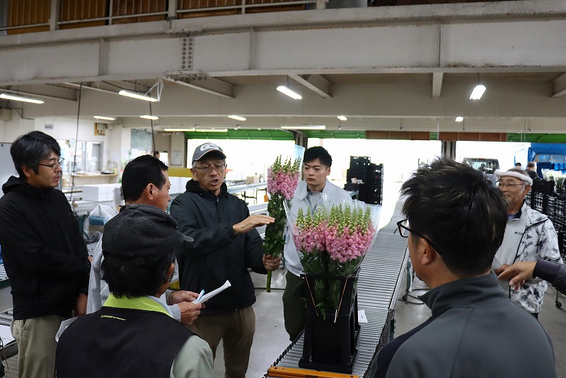 JA鶴岡金魚草専門班は10月27日、鶴岡市のJA北部集出荷場で金魚草の目揃い会を開き、生産者約10人が参加した。