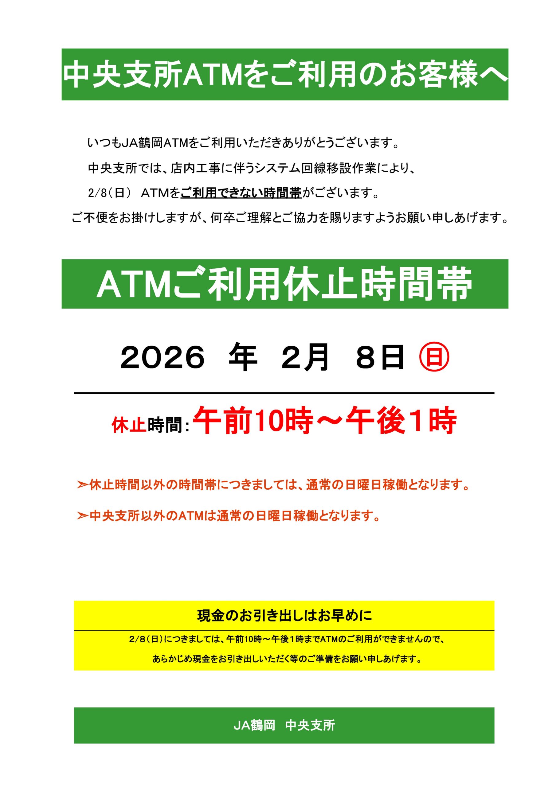 中央支所ATMの一時サービス休止について