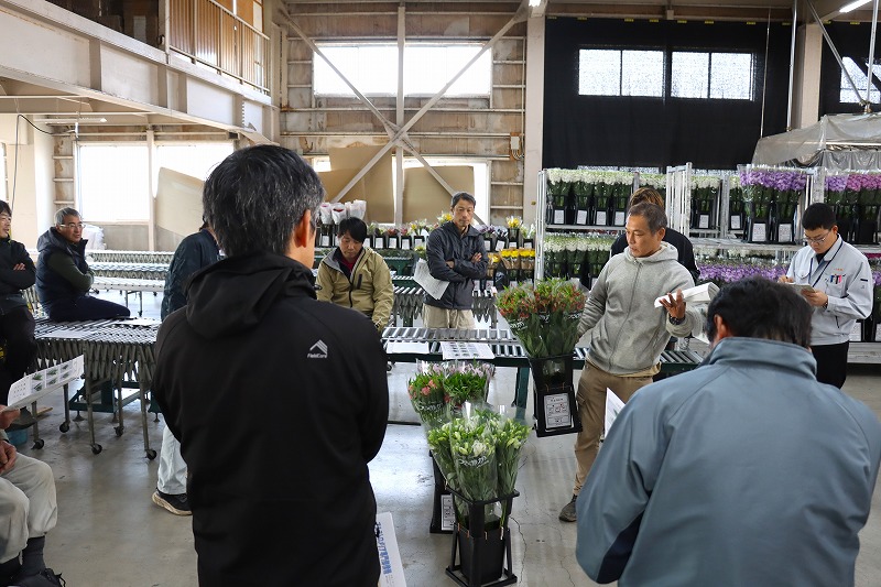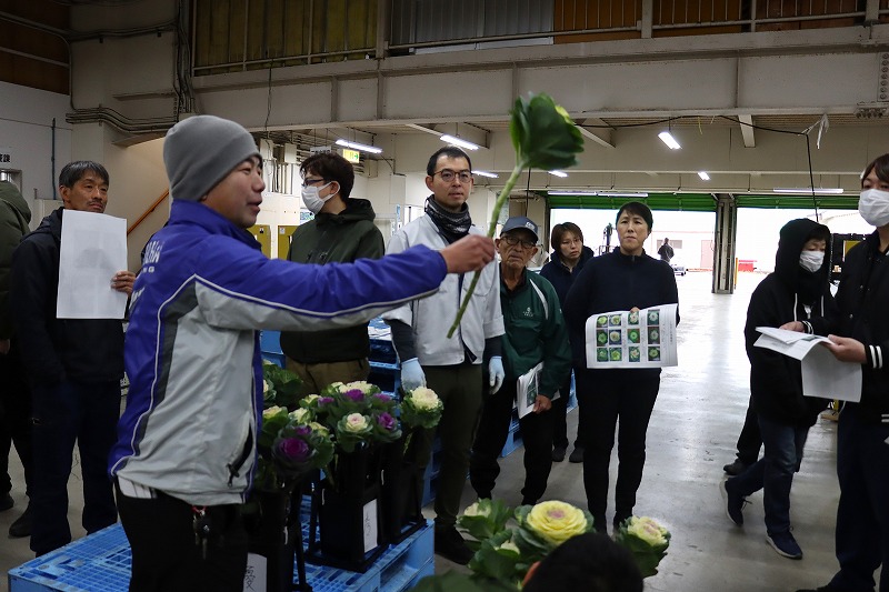 JAの園芸指導係は階級の変更点や規格など出荷の際の注意点を伝えた。参加者は、サンプルで色づきやバランスなど規格を確認し、草丈や緑葉の残し方、曲がりなどを共有した。